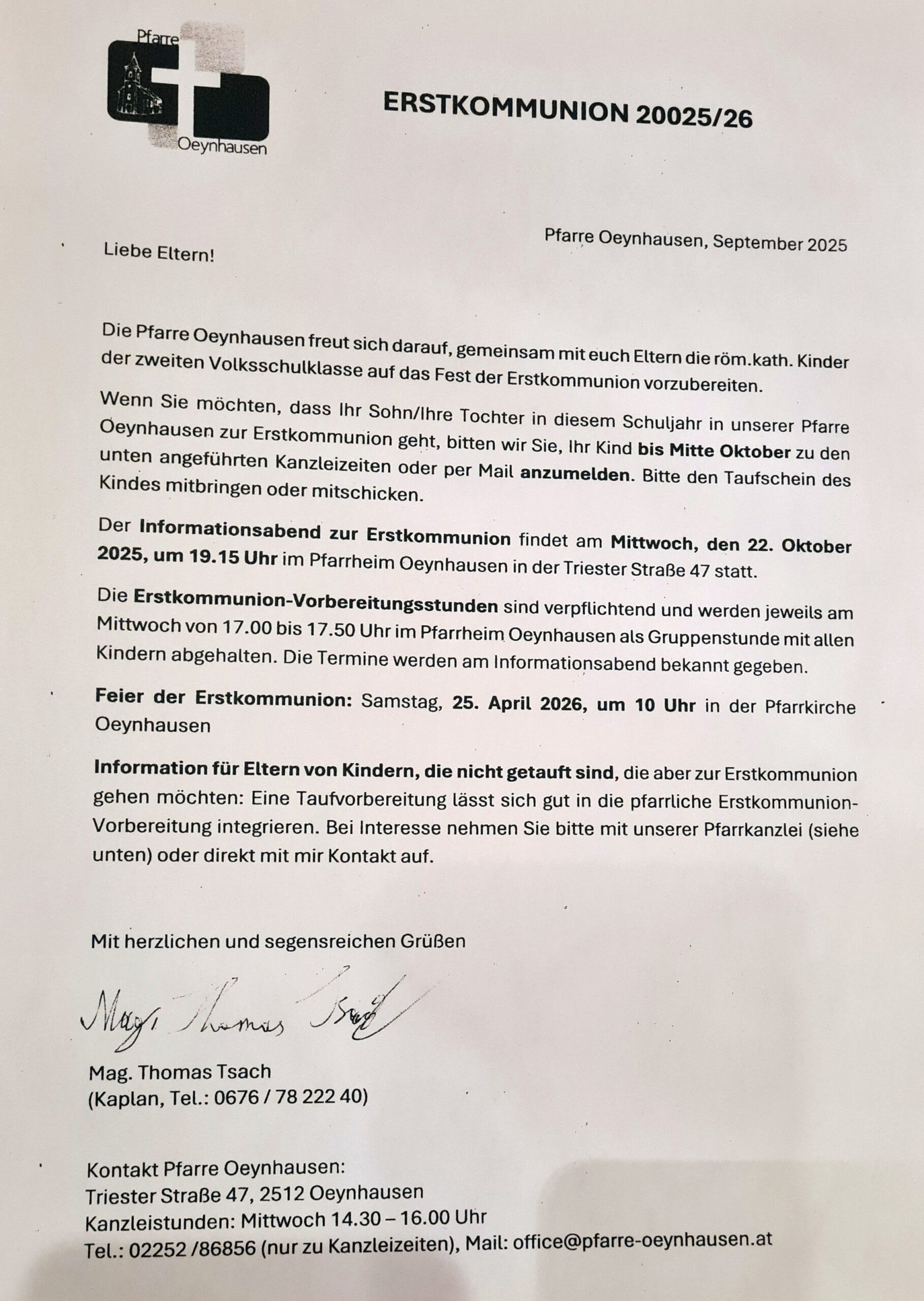 Die Anmeldung zur Erstkommunion erfolgt für gewöhnlich am Beginn der 2. Klasse Volksschule. Für die Anmeldung benötigen Sie den Taufschein des Erstkommunionkindes.